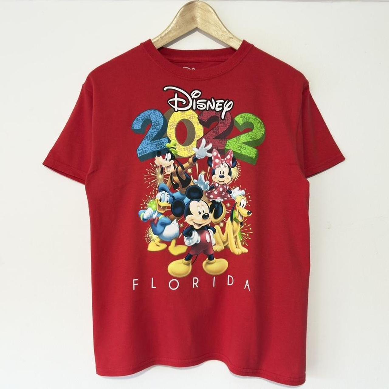 - 2022 red t shirt on Disney tag with "2022" text and characters, Florida text below.