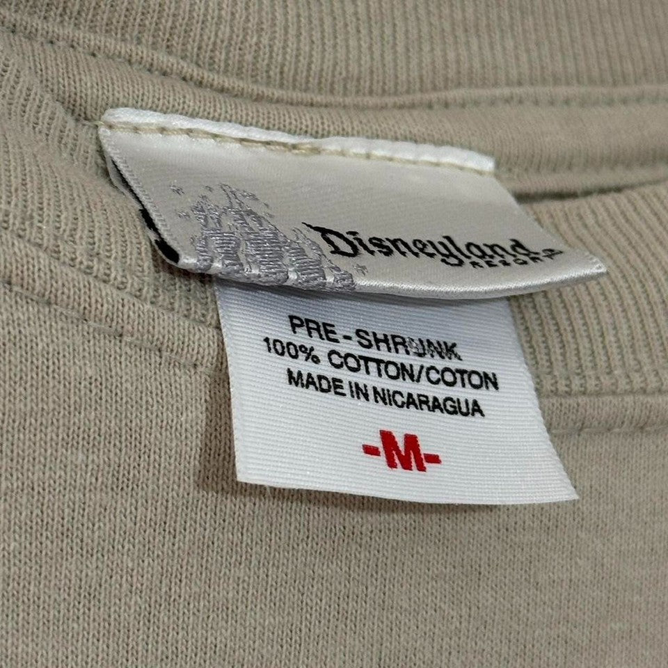 - 2000s beige t shirt by Disneyland Resort featuring front graphic of "Mickey" text with sunset and sandcastle, with palm trees surrounding.