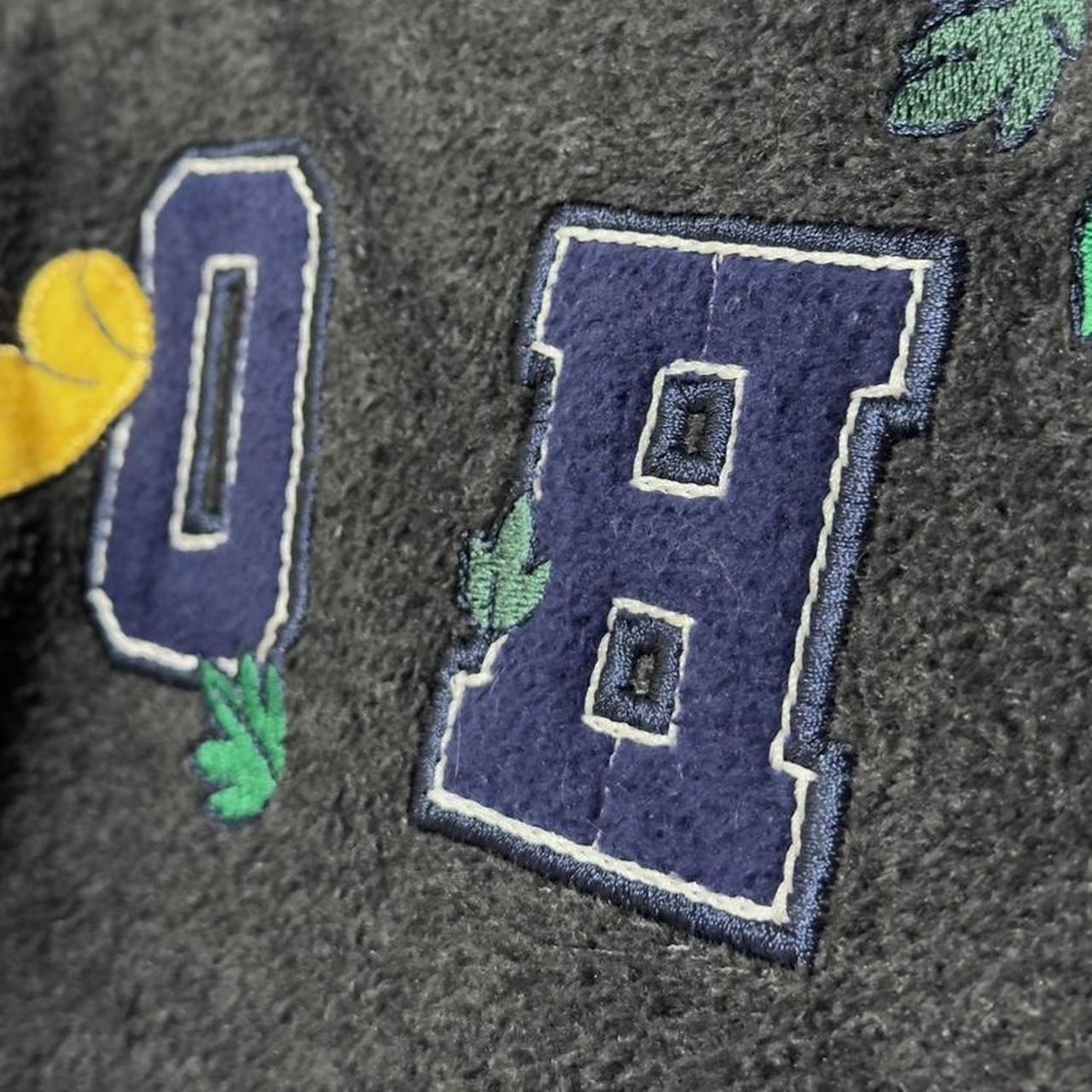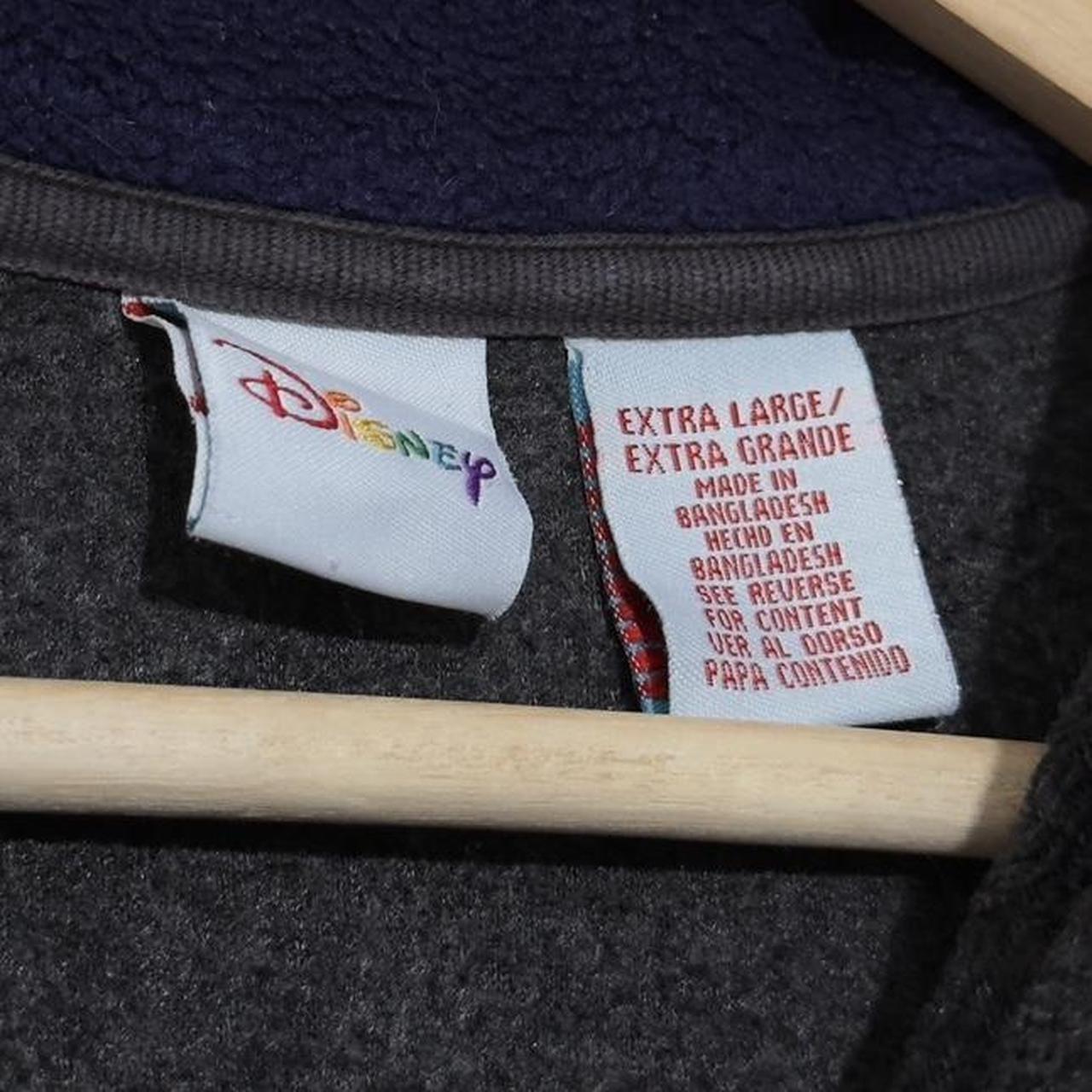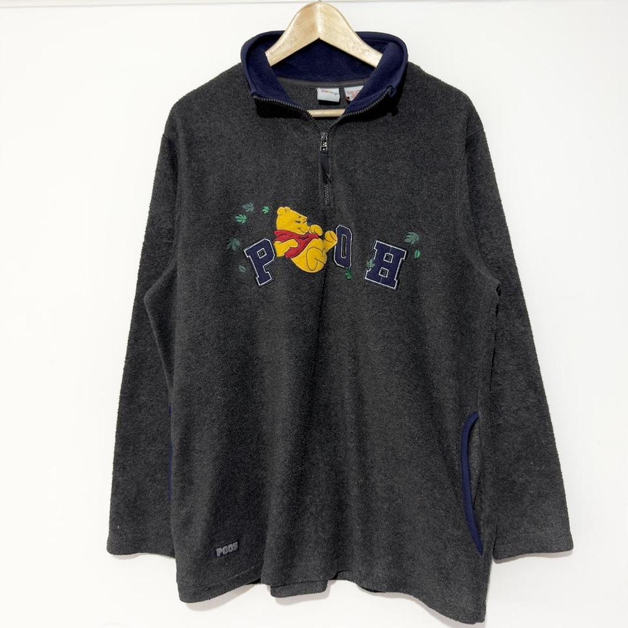 - 2000s dark grey fleece style quarter zip by Disney featuring embroidered "Pooh" across chest with pooh laying down with leaves around. Side pockets.