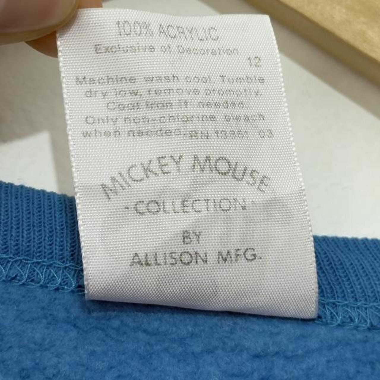 - Made in USA 1980s blue sweatshirt by Walt Disney Productions featuring Mickey Mouse face on front with "Mickey Mouse" text around.