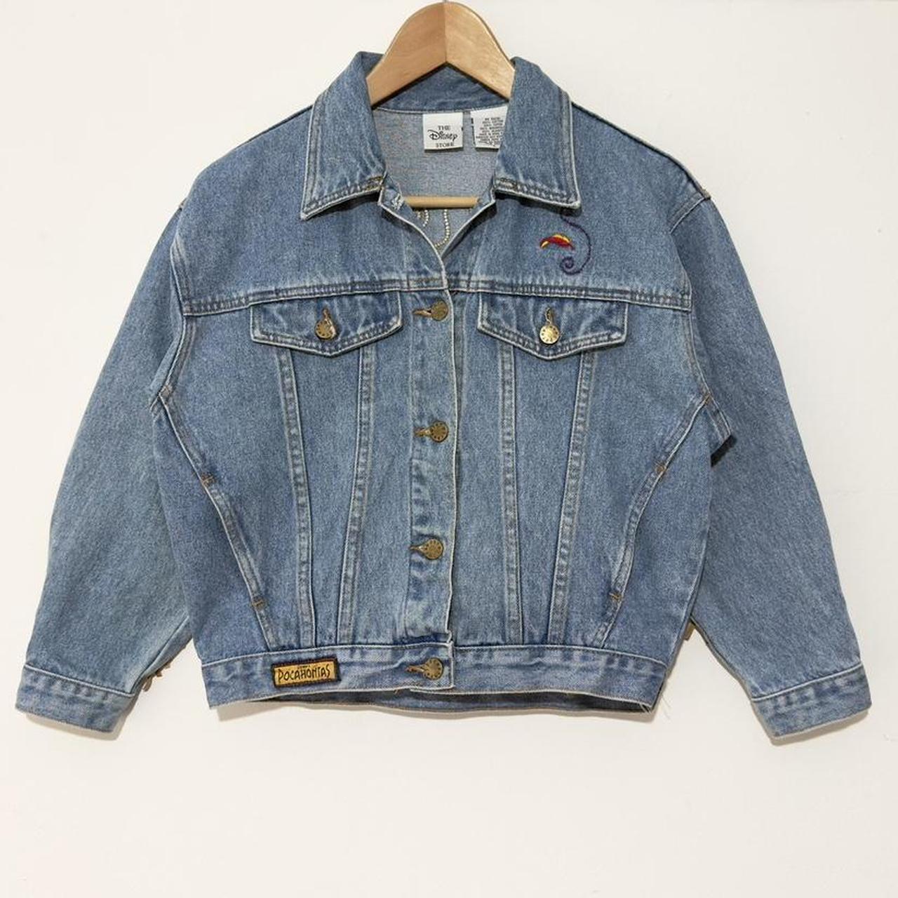 - 90s blue denim jacket by The Disney Store featuring embroidered falling leaf on upper chest, Pocahontas patch on lower front, on back is embroidered Pocahontas and Meeko, with brown tassles on back of sleeves.