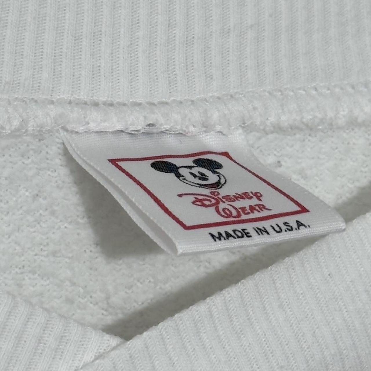 - 1990 white sweatshirt by Disney Wear featuring front graphic of Sorcerer Mickey with sparkles all around, castle design with "35" on it with "Years of Magic" below. Disneyland text logo at the bottom. plain white on back. thinner material.