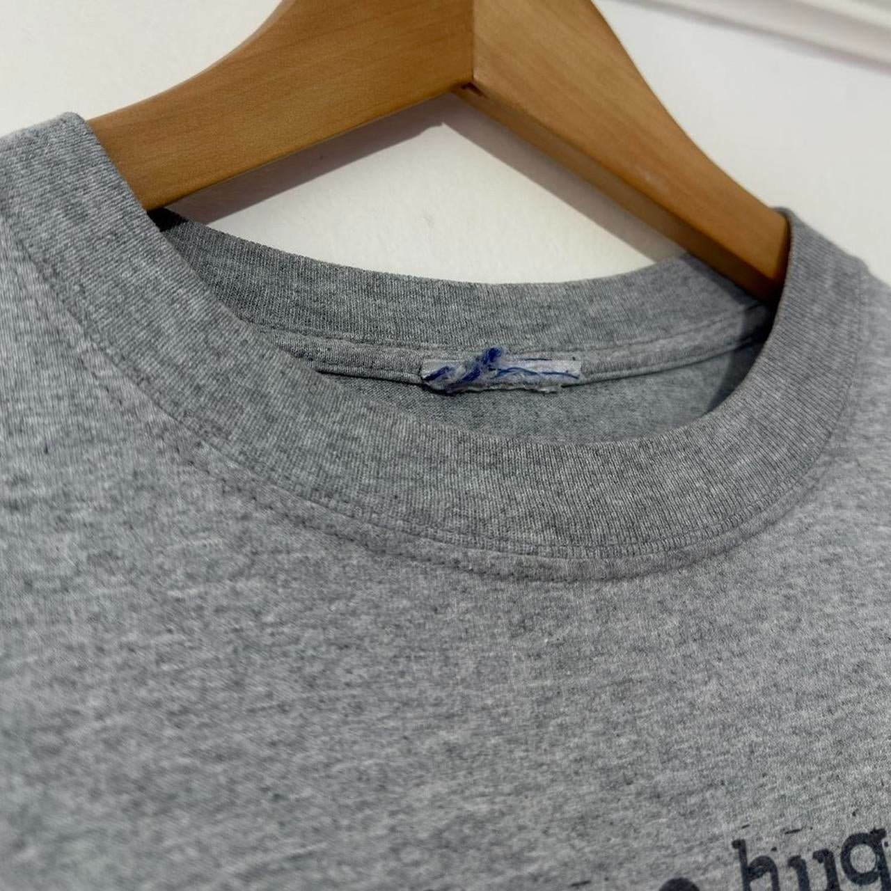 - early 00s grey t shirt by Disneyland featuring front graphic of Dopey, Grumpy and Happy with Grumpy with angry face, and text above and below.