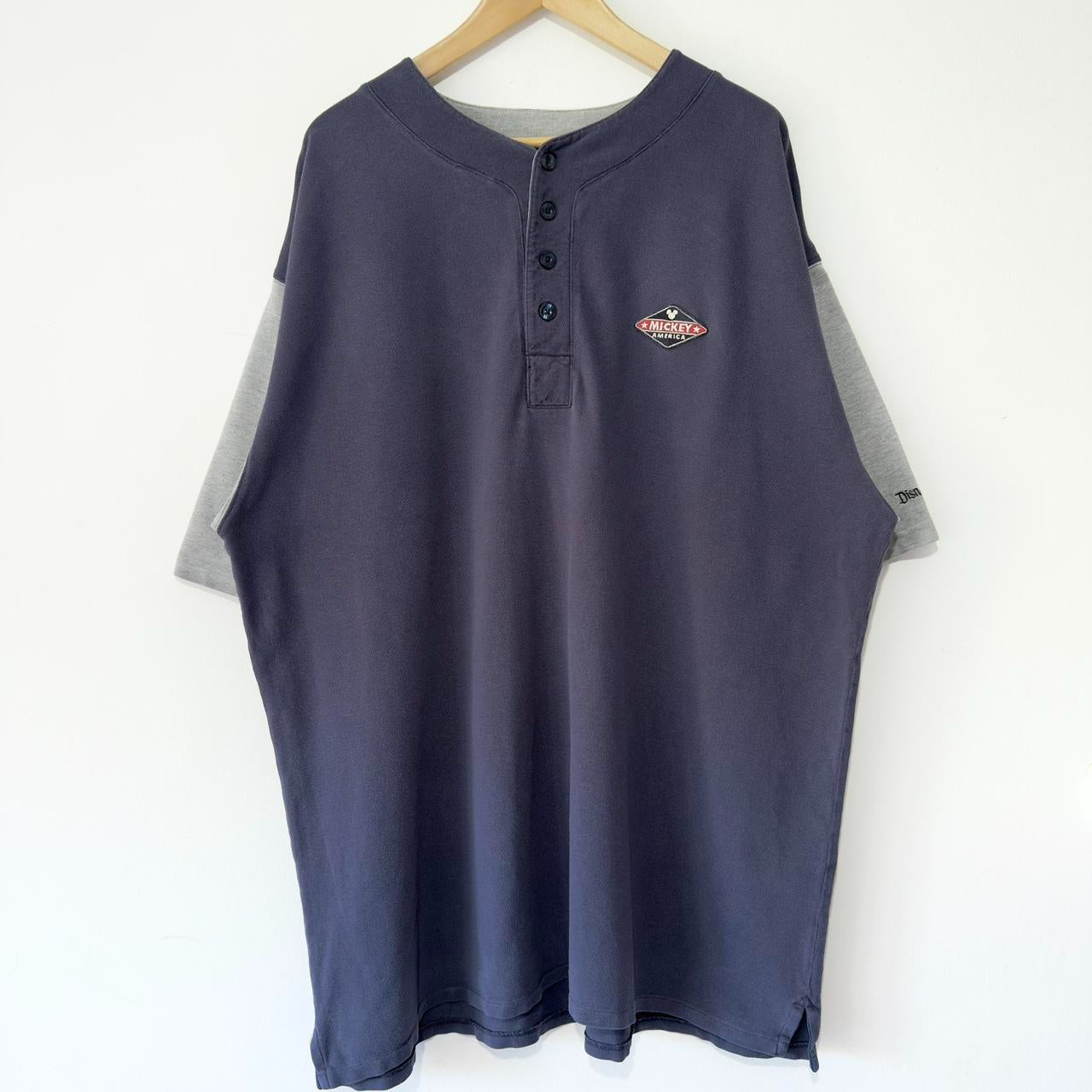 - 00s navy and grey t shirt by Disneyland featuring embroidered patch on front "Mickey America", with Disneyland text on sleeve. Button up design on collar.