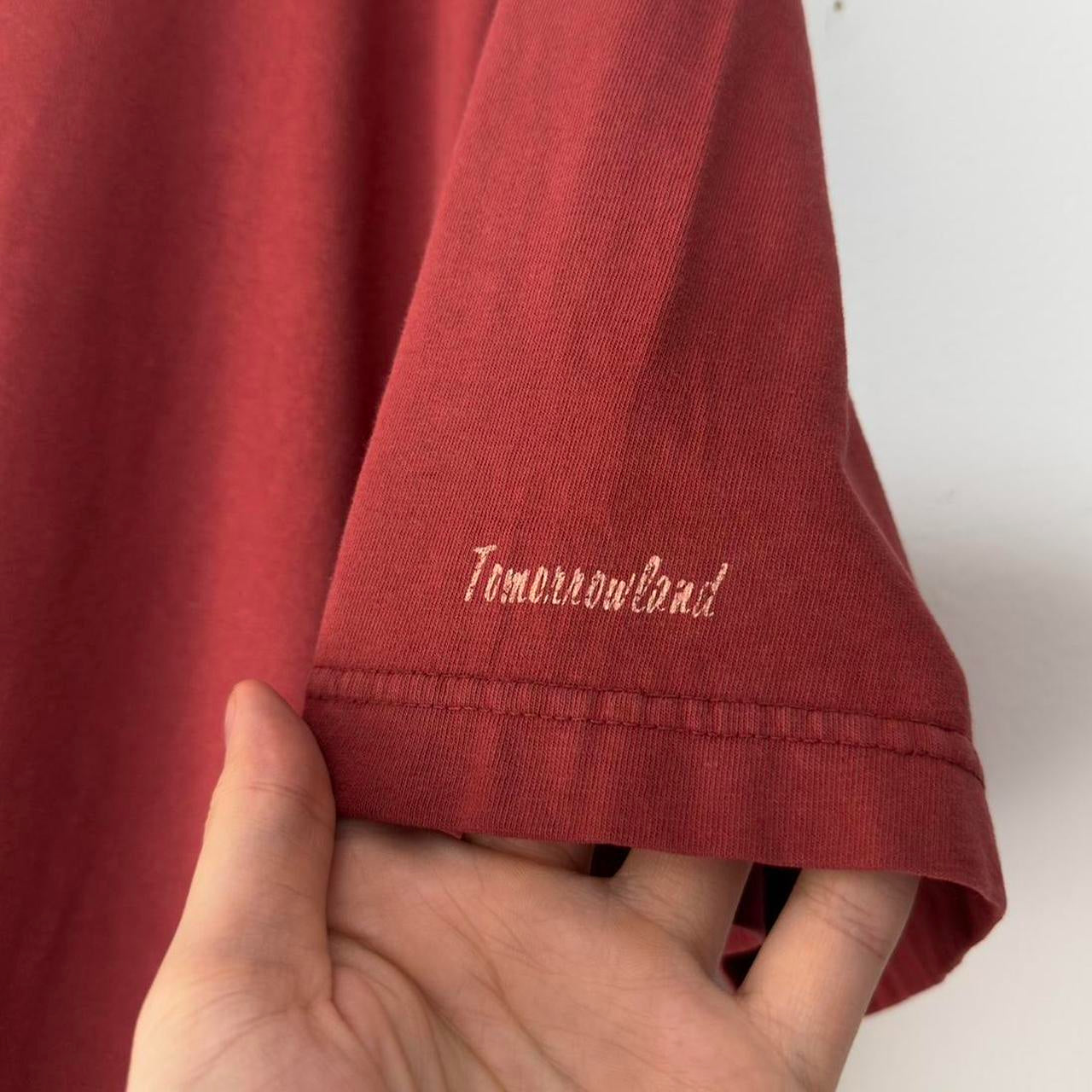 - faded brick red-ish colour early 00s t shirt by Disneyland featuring Moonliner blueprints on back, with small Moonliner design on front. On sleeve is "Tomorrowland" text
