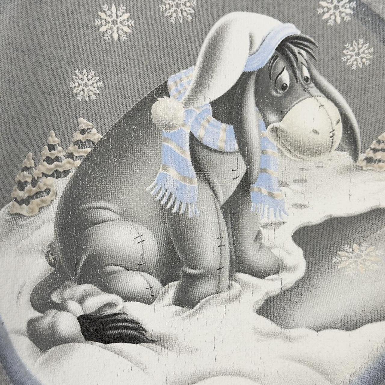 - Early 00s grey sweatshirt by Disney Store featuring front graphic of Blue ring around snowy scene of Eeyore with text "Wonder is All Around"