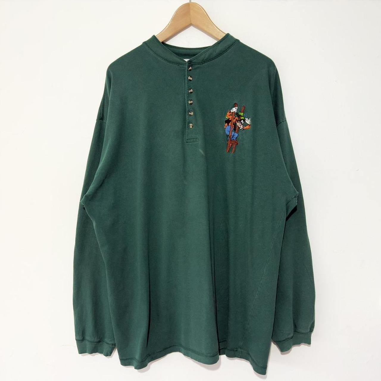- 90s green henley long sleeve by The Disney Store featuring embroidered Goofy on stilts.
