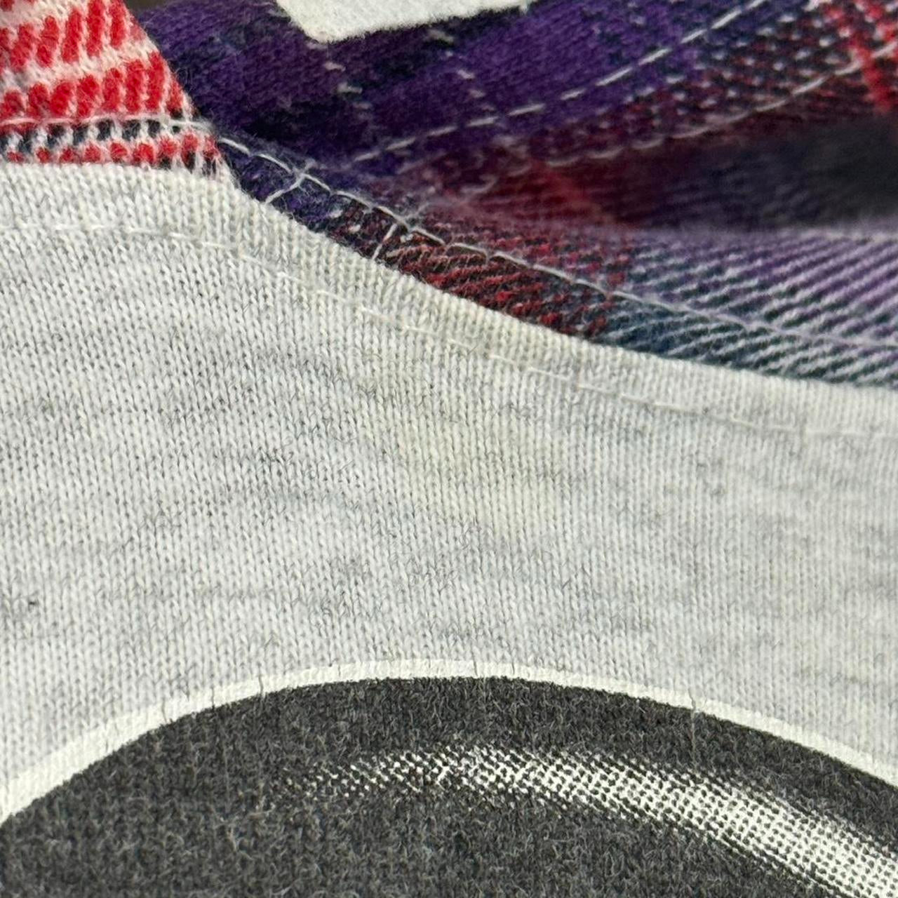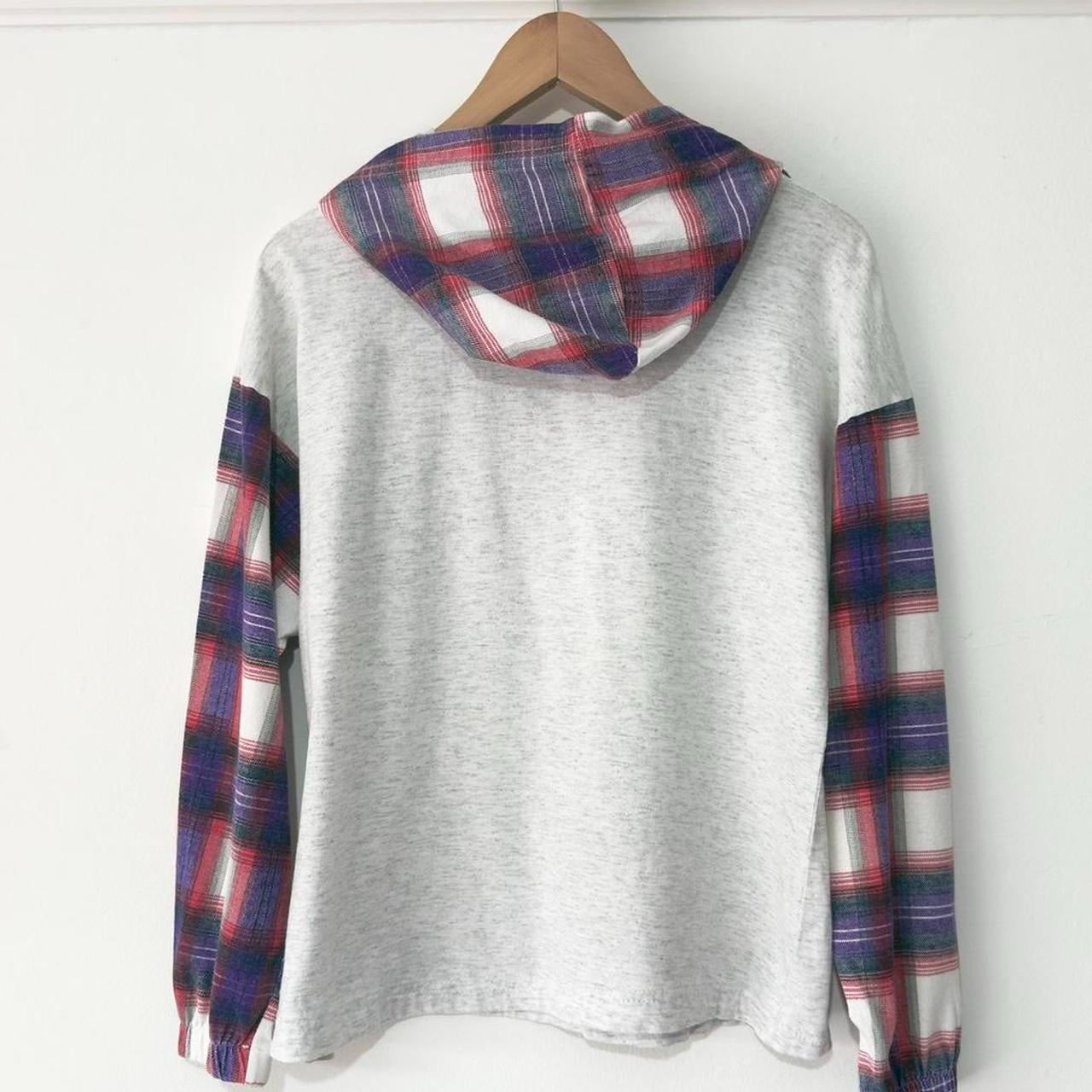 - 90s lightweight grey long sleeve hoodie by Mickey Unlimited featuring front graphic of Mickey mouse with plaid hoodie and sleeves. T shirt material.