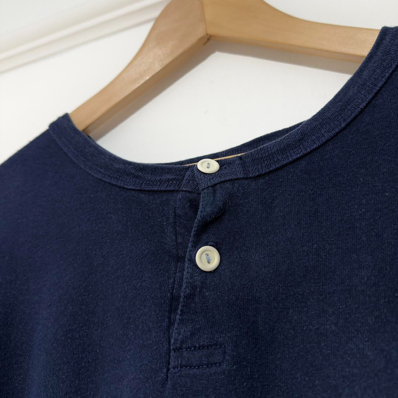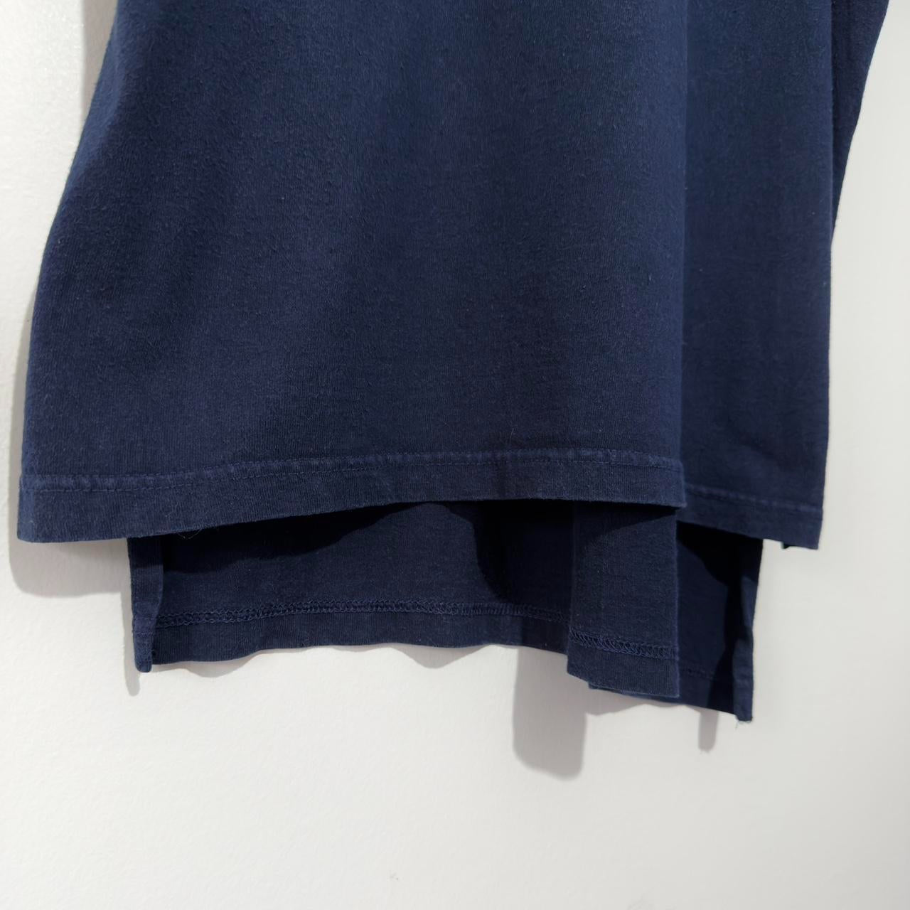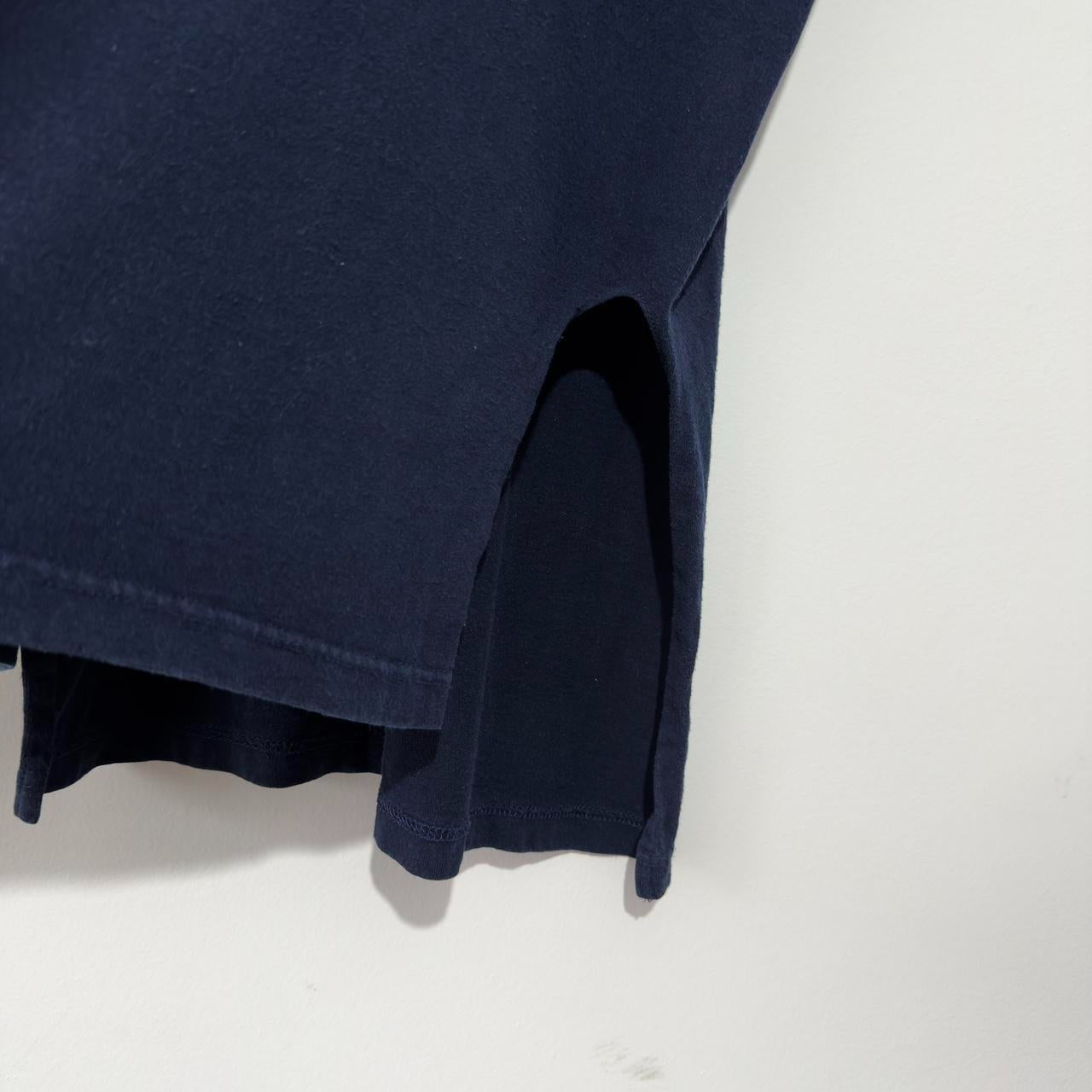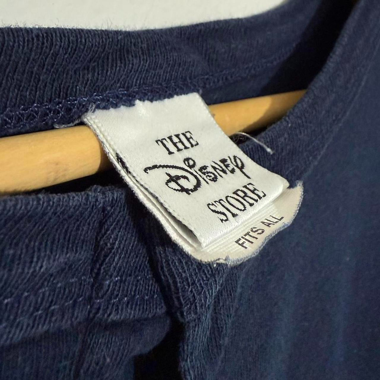 - 90s Made in USA navy long t shirt by The Disney Store featuring front graphic of Mickey & Friends, collar button up, longer back of t shirt, with wide openings around bottom sides.