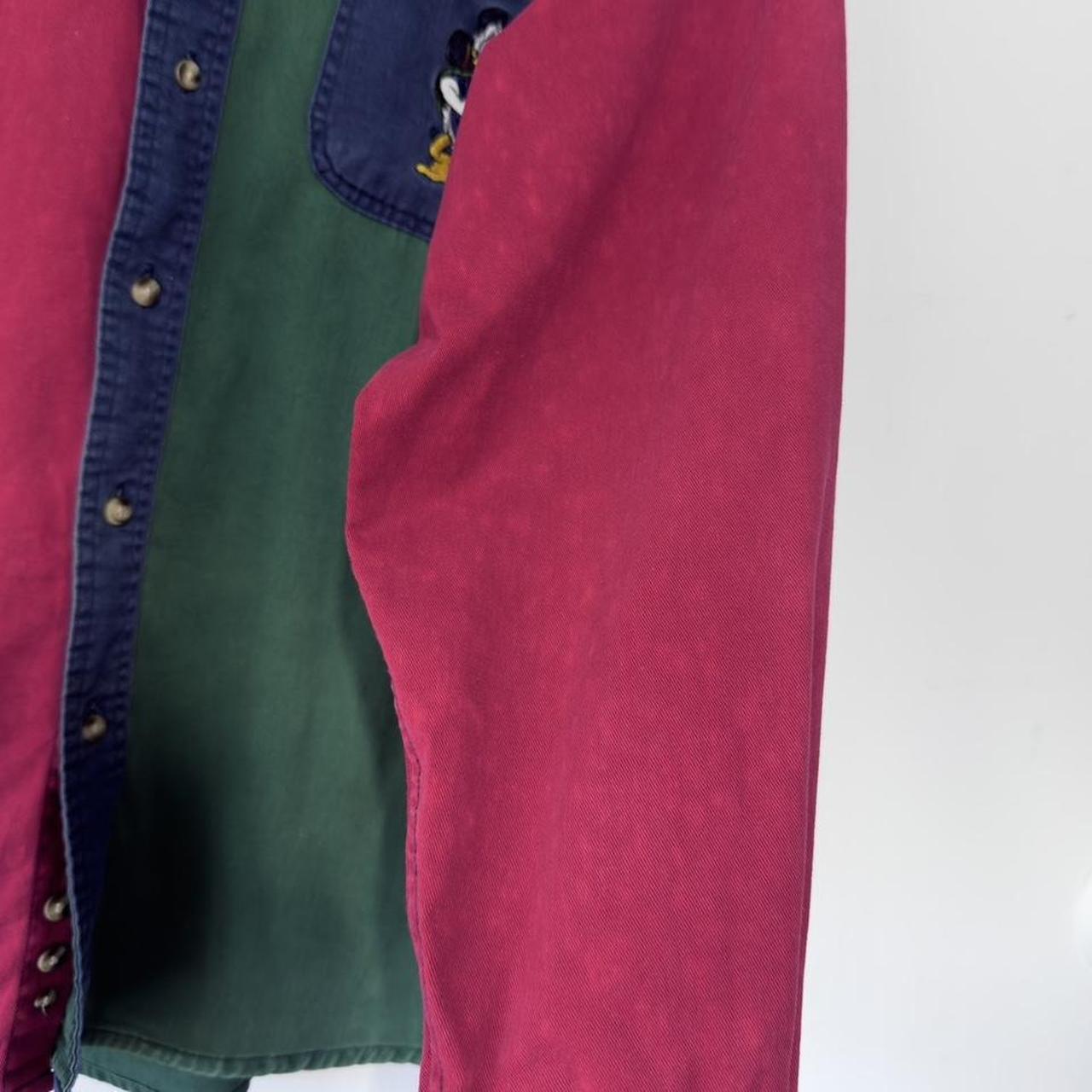 - 90s colour block button up collared shirt by Disney Store featuring front embrodiered hiking Donald Duck on Front, with Mickey & friends hiking through the wilderness on the front.Ā
