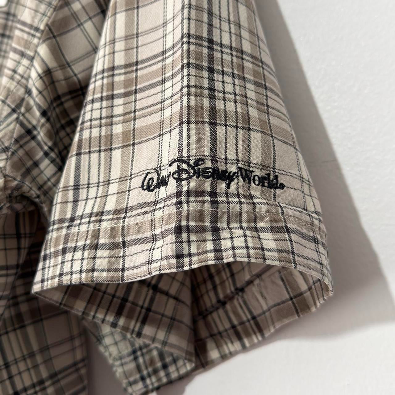 - early 00s beige/brown checkered shirt by Walt Disney World featuring front emblem of Mickey on chest, with "Walt Disney World" logo text on sleeve.Ā