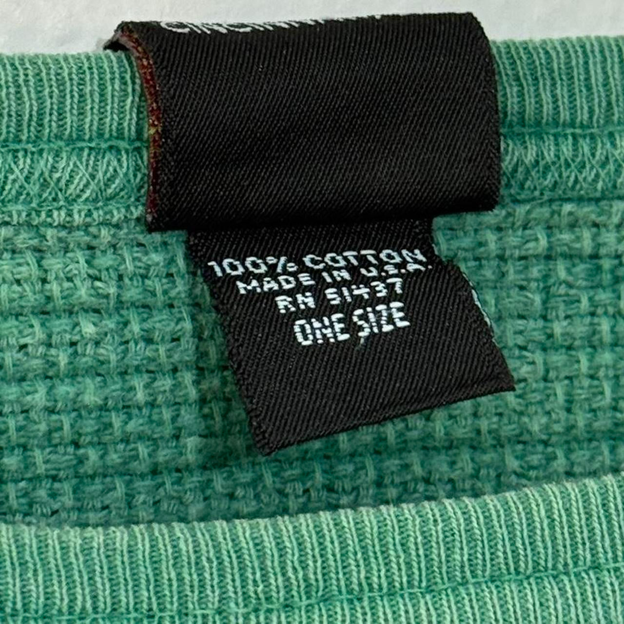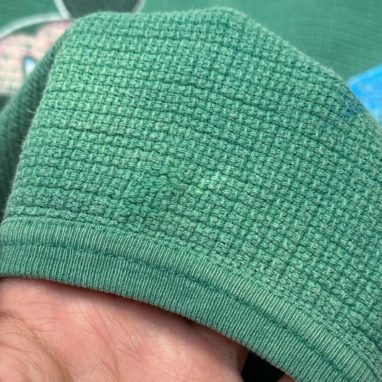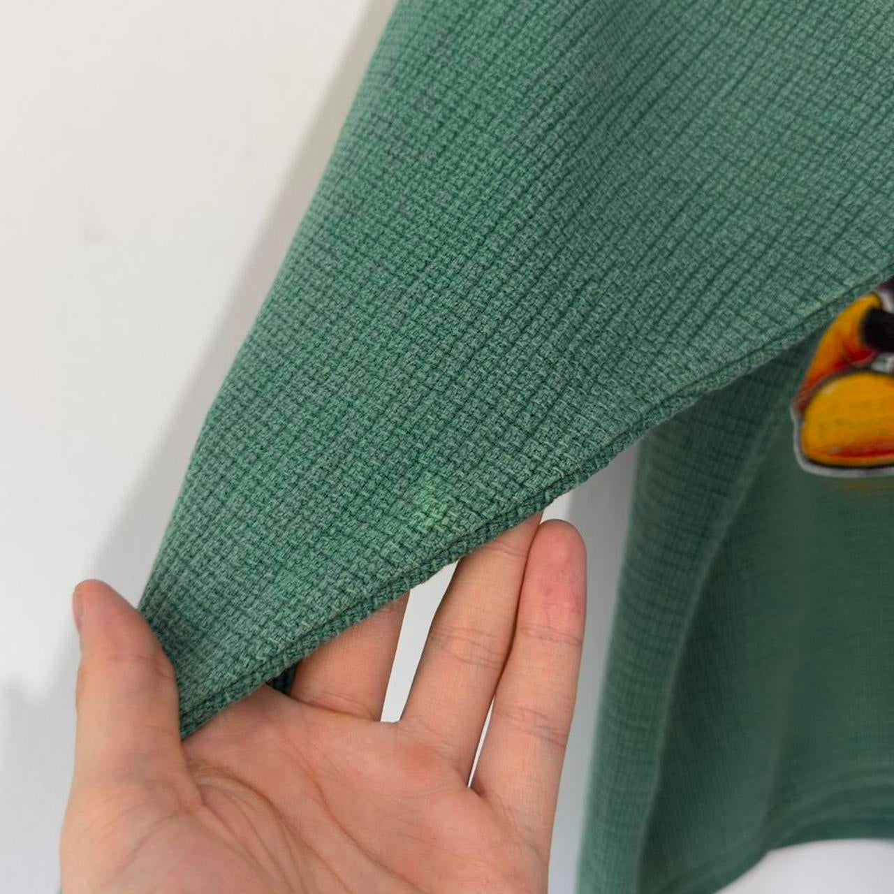 - Late 90s Made in USA green waffle sweatshirt by Mickey Unlimited featuring front graphic of Mickey leaning on "M"