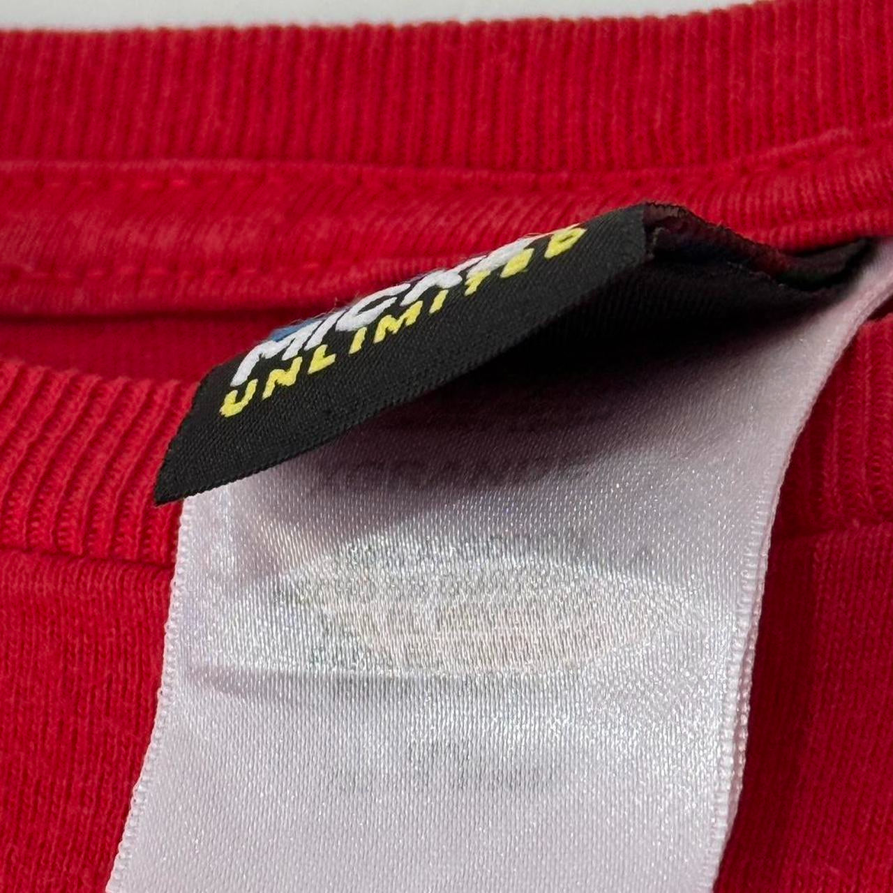 - Late 90s/early 00s red t shirt by Mickey Unlimited featuring front graphic of Mickey Mouse with check list next to him, with "all of the above" checked.