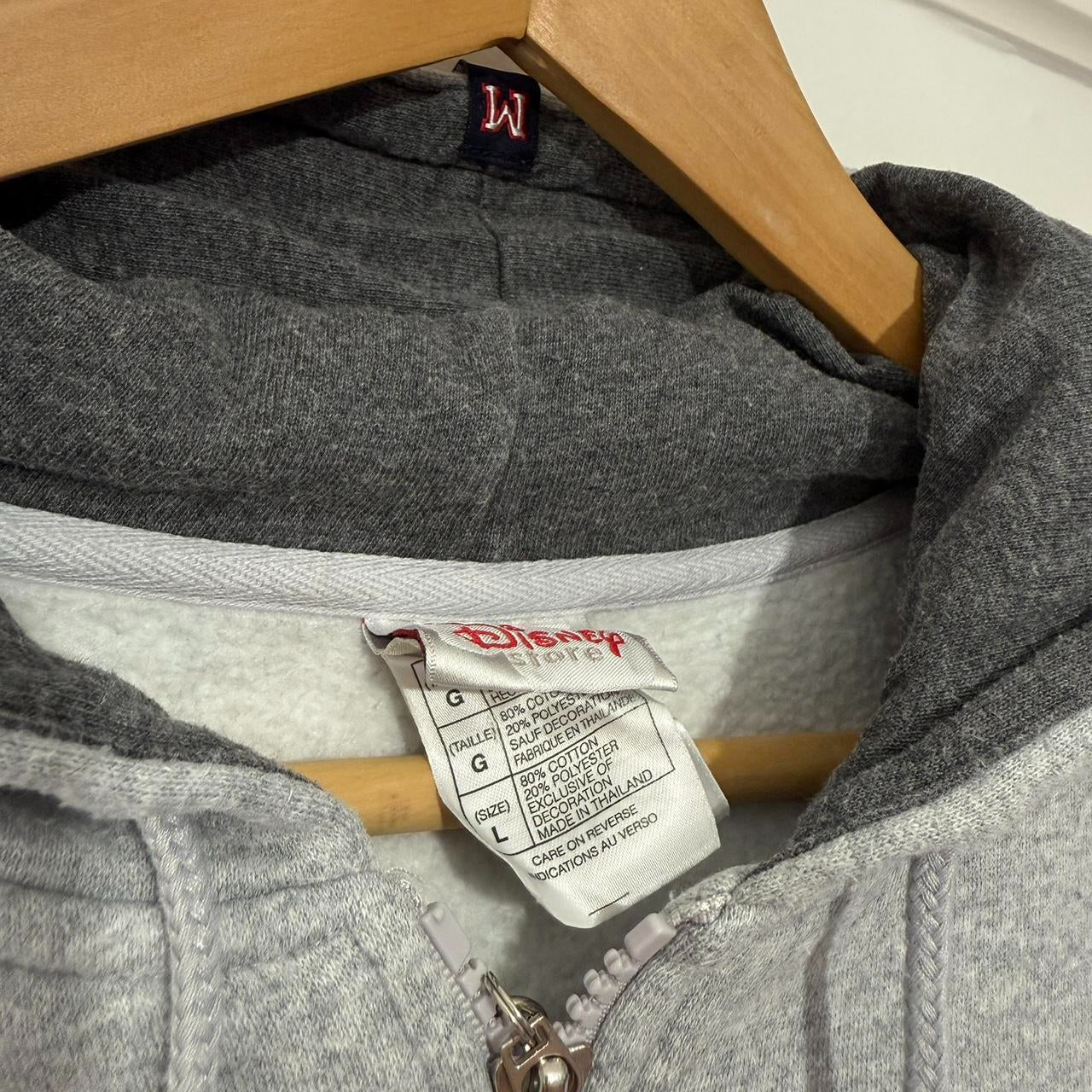 - early 00s grey zip up hoodie by Disney Store featuring embroidered Mickey Mouse on chest, small patch on pockets and M patch on top of hood