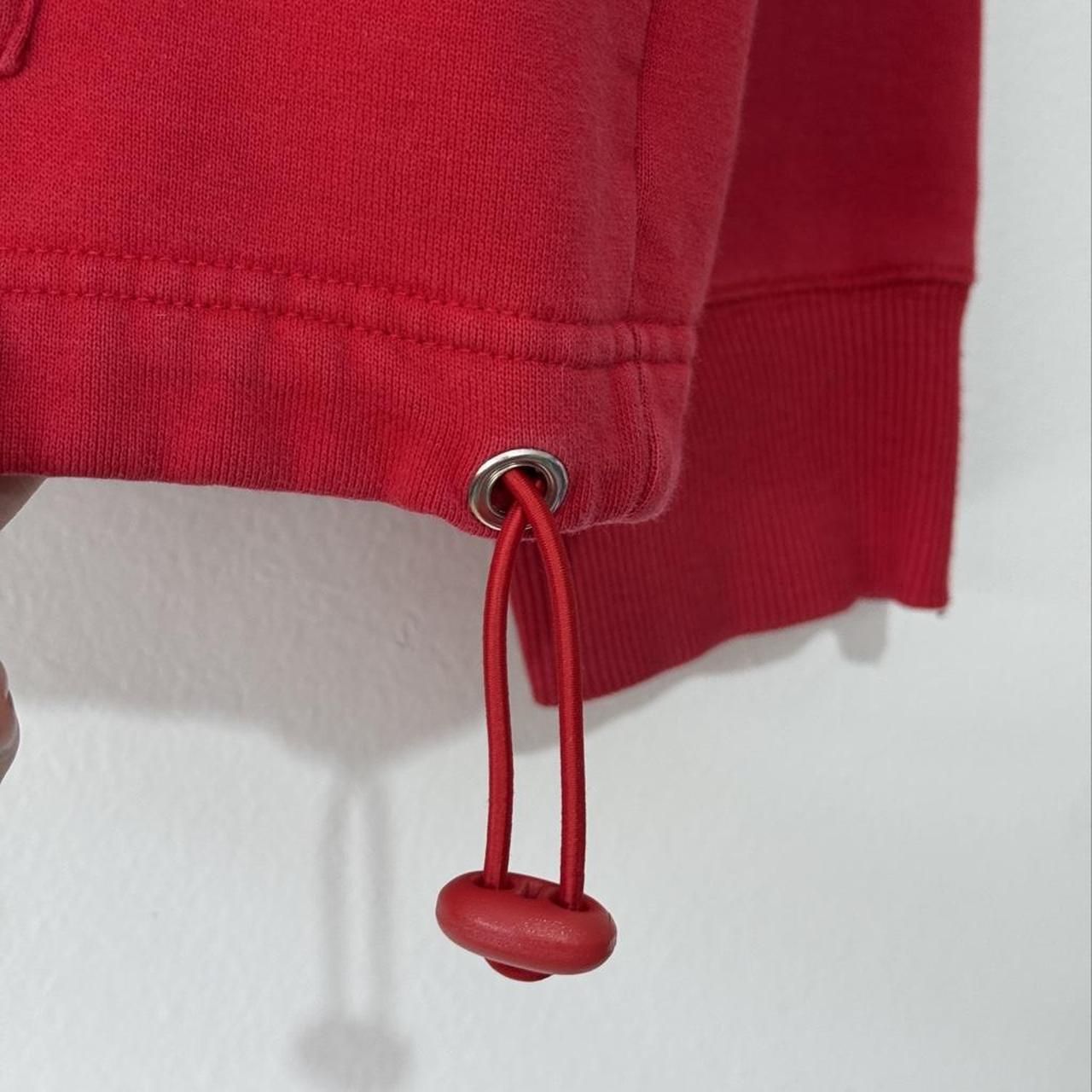 - early 00s red hoodie by Disneyland featuring mickey outline face on front, with patches on upper sleeve and pocket.