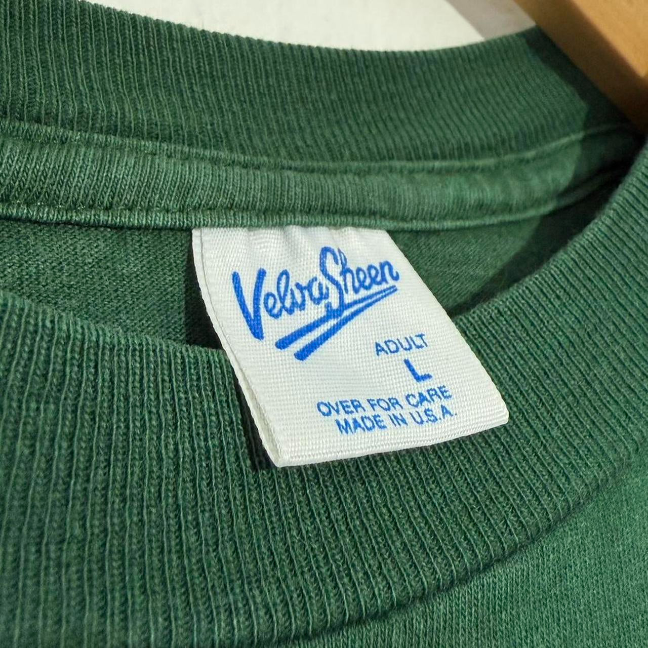 - 90s Made in USA green coloured t shirt by Velva Sheen featuring Mickey Mouse with sunglasses standing up against "WISCONSIN" in white down the side.