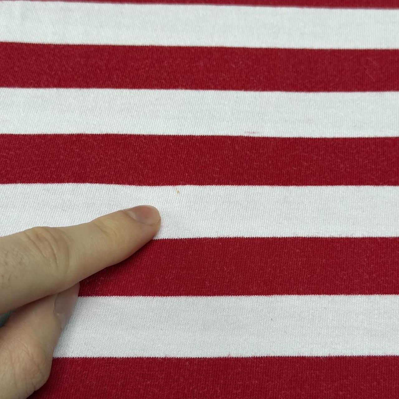 - 90s red and white striped t shirt by Mickey Inc featuring embroidered Mickey text and three mickey's on text.