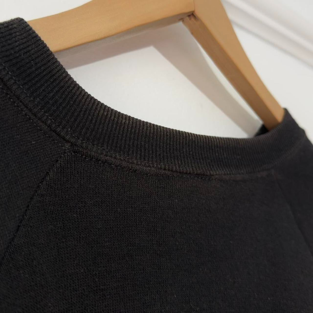 - Made in USA 80s black sweatshirt by Disney Character Fashions featuring front design of felt Mickey Mouse with "Walt Disney Productions" text, with stripes on sleeves.