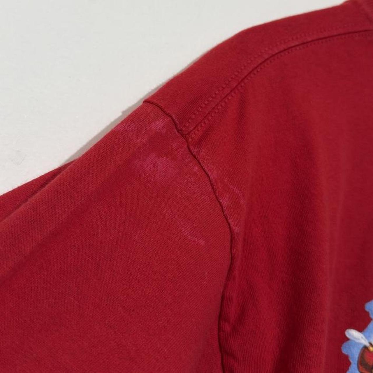 - 2004 red t shirt by Walt Disney World featuring front graphic on chest of MVMCP text with mickey putting star on tree, with big graphic on back of snowy tree, with Christmas parade float