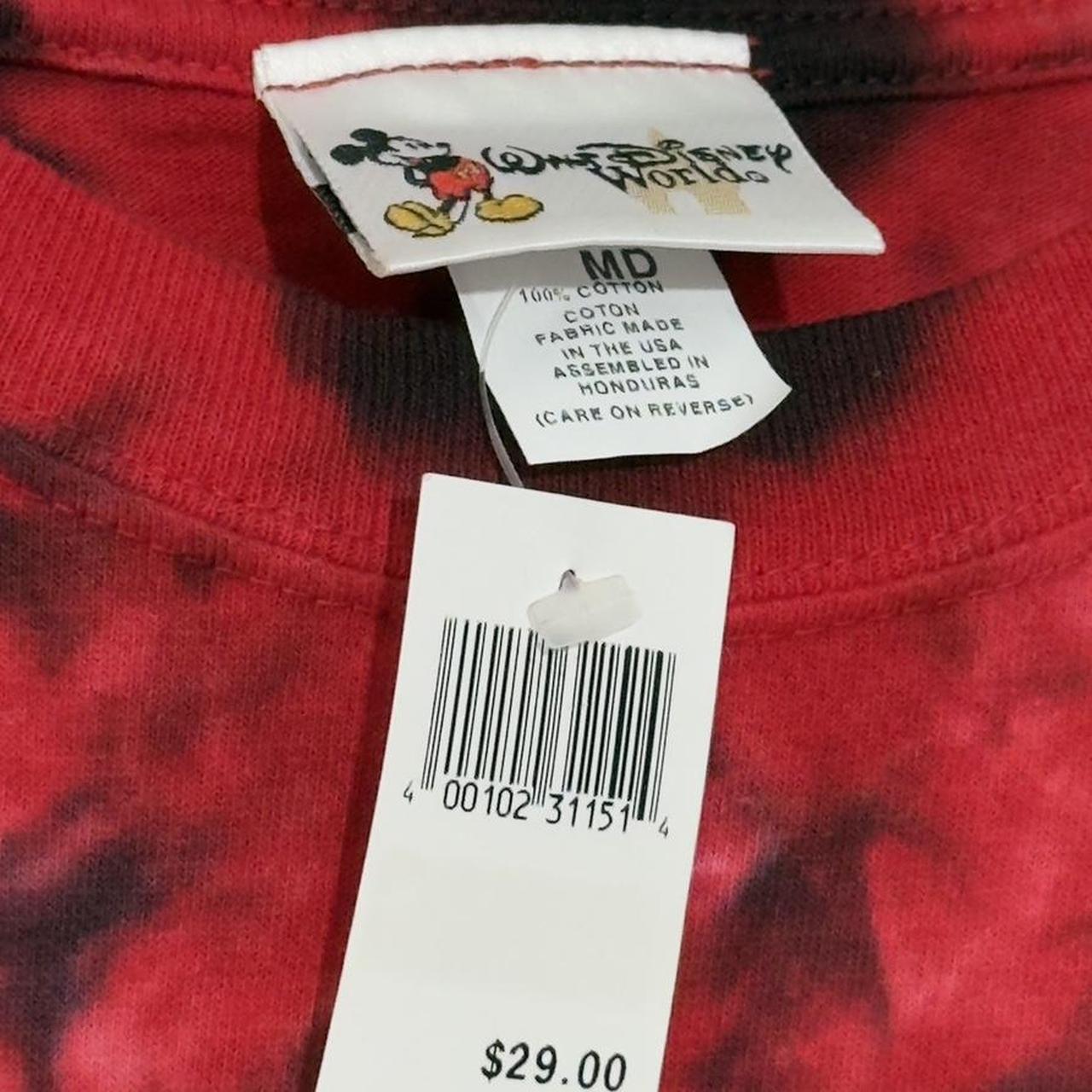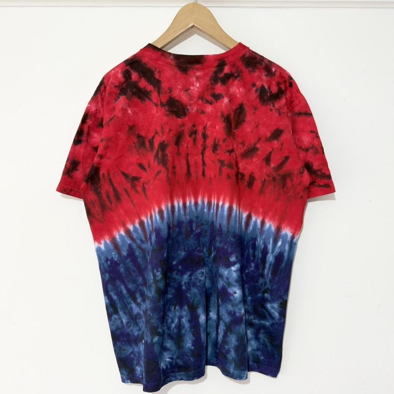 - 2000s red/blue tie dye t shirt by Walt Disney World featuring front graphic of Mickey riding spaceship with text "Spaced Out!" and "Space Mountain Magic Kingdom" text below.