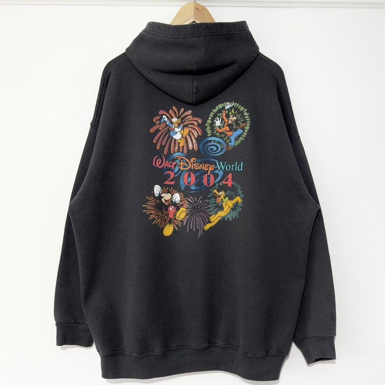 - 2004 faded black zip up hoodie by Walt Disney World featuring front graphic of "2004" with mickey ears, with big back graphic of fireworks behind mickey & friends and text in centre.