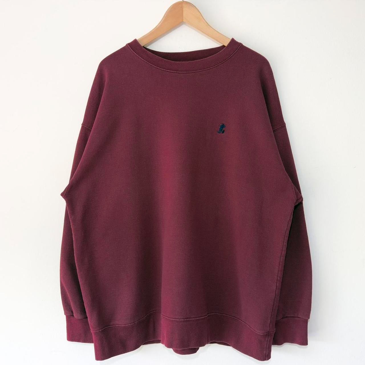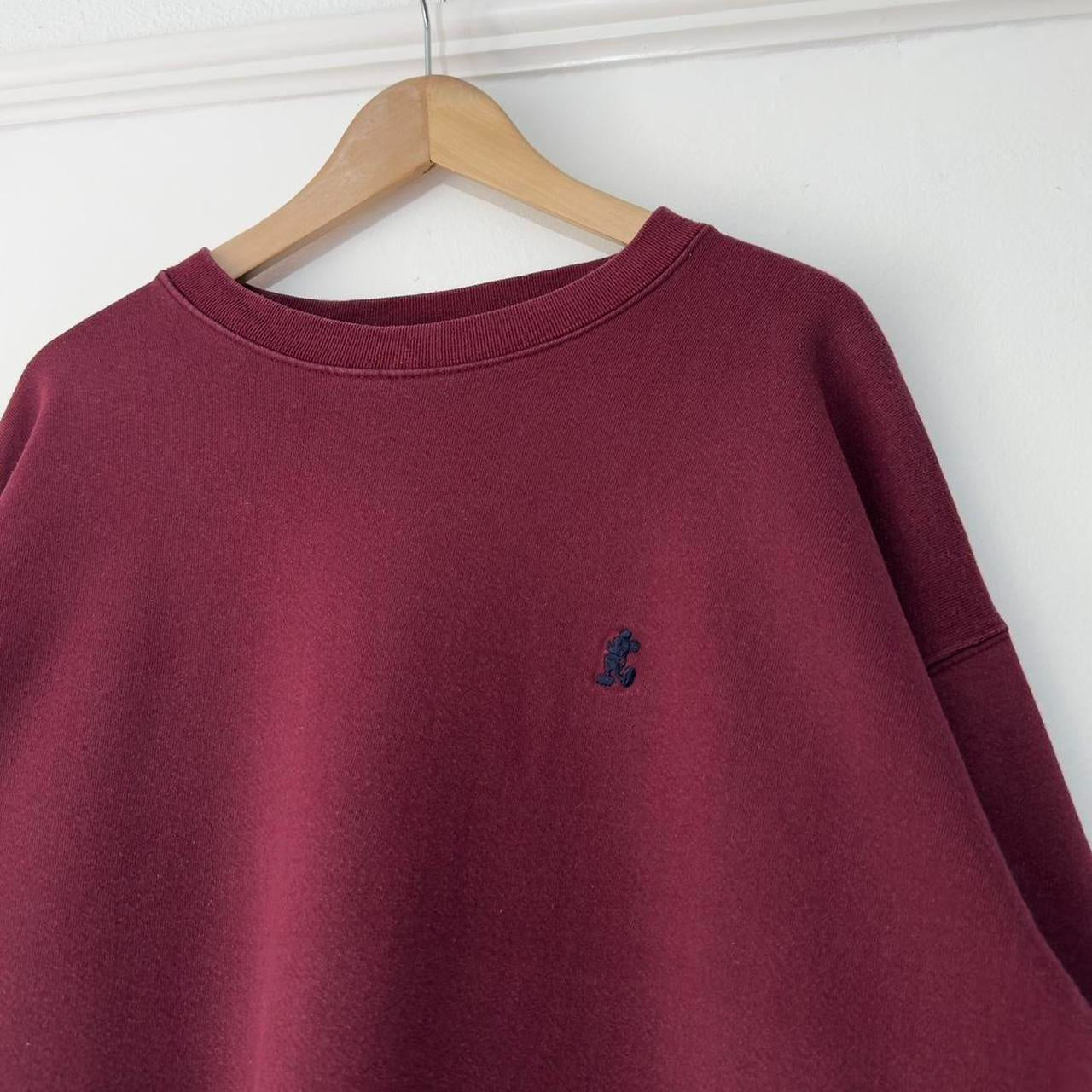 - Made in USA early 00s burgundy maroon sweatshirt by Walt Disney World featuring embroidered navy mickey emblem on chest, and Walt Disney World text on back neck.