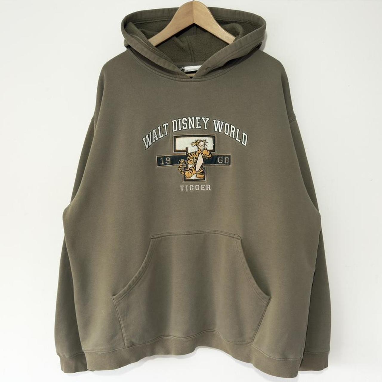 - Early 2000s khaki hoodie by Walt Disney World featuring front embroidered "Walt Disney World" letters and "T " with tigger in front. Below is "Tigger".