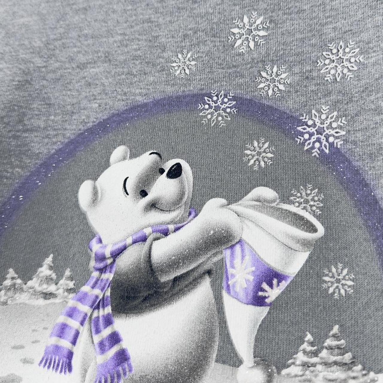 - early 00s grey sweatshirt by Disney Store featuring front graphic of Winnie the Pooh holding winter hat with purple ring around, and Capture the Magic text below.