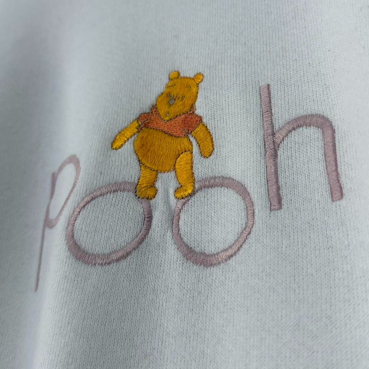 - Late 90s white sweatshirt by Fruit of the Loom featuring embroidered "Pooh" text with pooh standing on top.