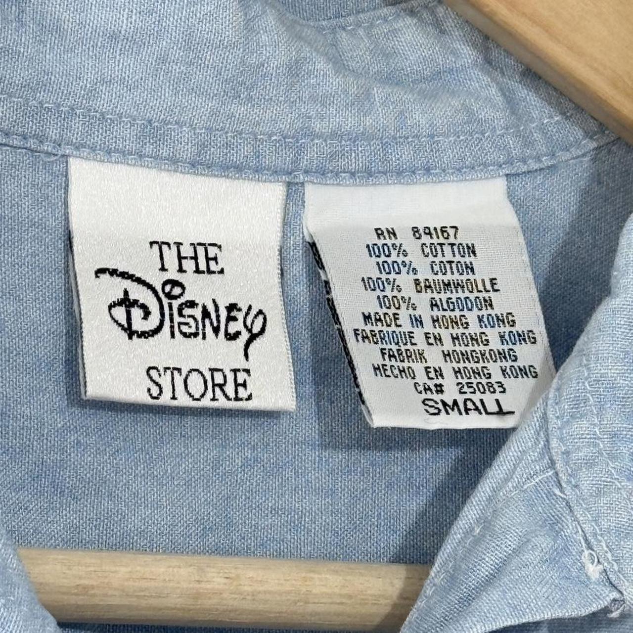 - 90s blue button down shirt by The Disney Store featuring embroidered Piglet and textured Winnie the pooh around flowers.