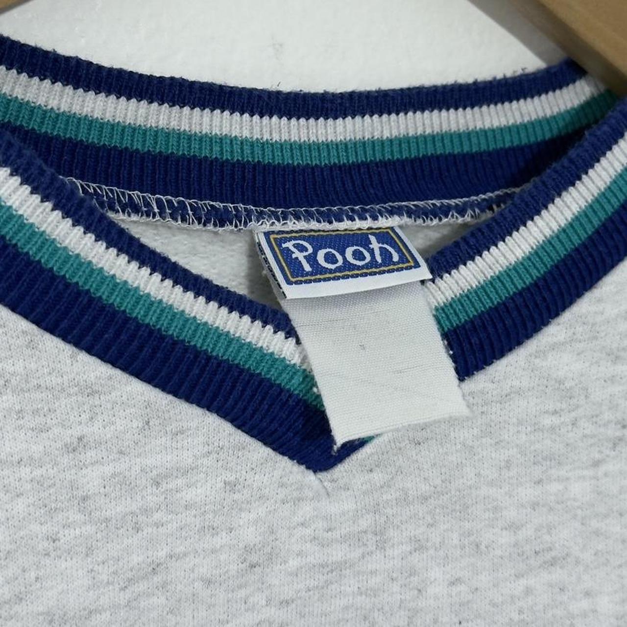 - grey 90s sweatshirt on Pooh tag with blue/green/white striped on cuffs and V neck, front graphic of Winniethe Pooh with Teas/Teapots around, and "Tea Time" text behind. Relaxed hem.