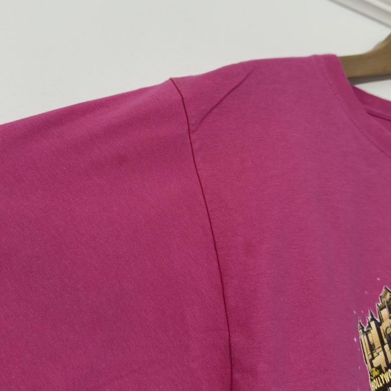 - 2016 pink t shirt on Disney tag with front graphics of Walt Disney World locations and characters, with 2016 text across front.