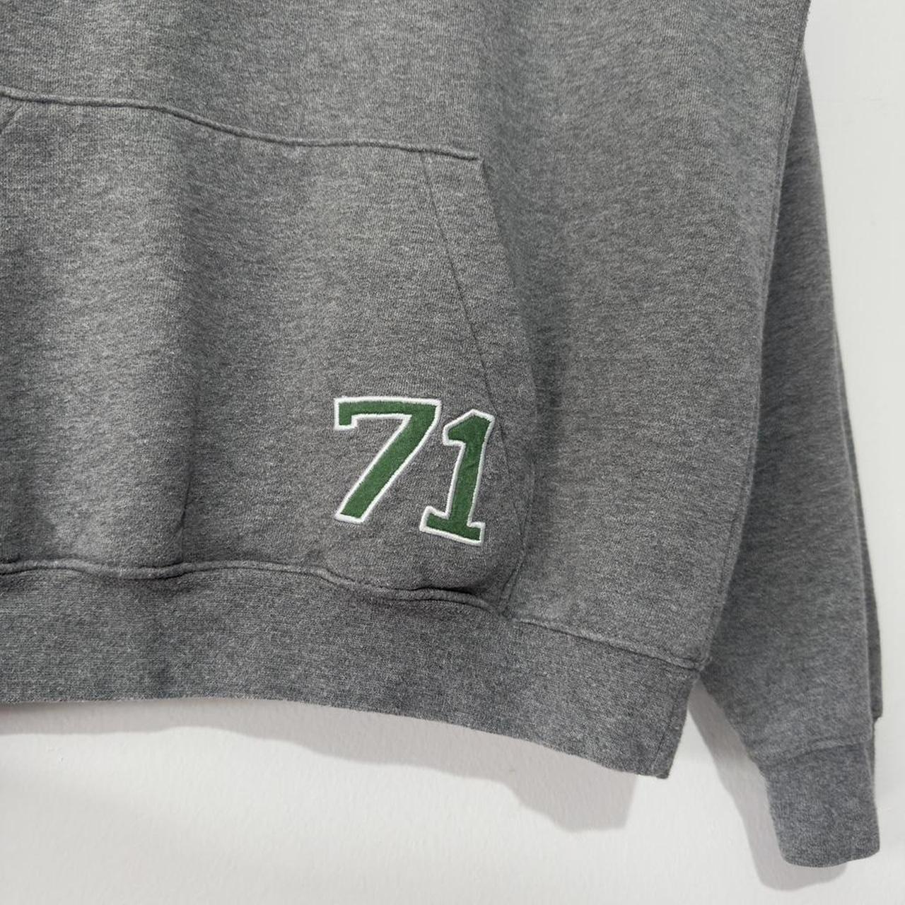 - Late 2000s grey hoodie on Walt Disney World tag with embroidered shield design on front with mickey, and 71 on pocket.