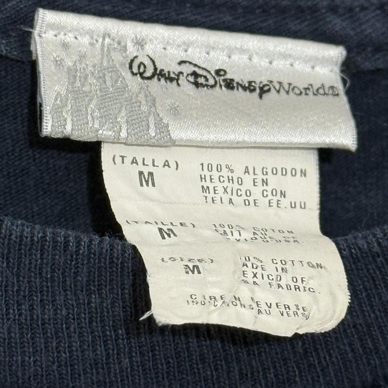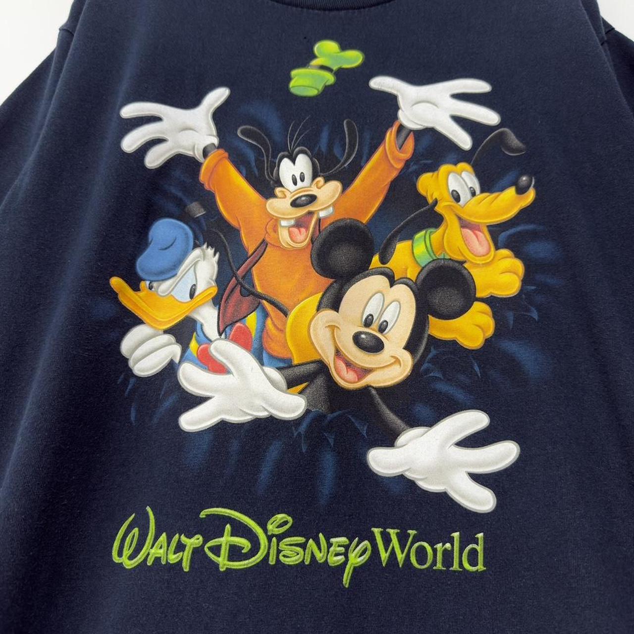 - 00s navy t shirt by Walt Disney World featuring front and back graphic of Mickey & friends jumping throug.