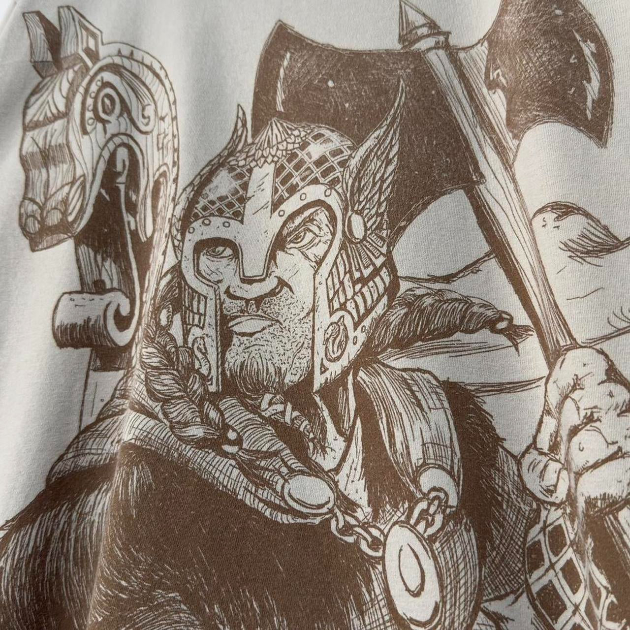 - Beige colour t shirt by Disney Parks featuring brown design of Viking on front with "Norway Epcot" text below.