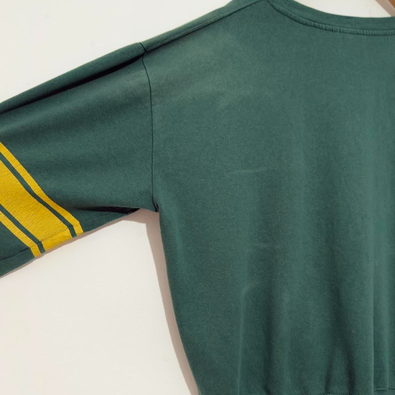 - green and yellow stripe sweatshirt by Disney featuring front graphic of Winnie the Pooh doing a front roll on the front, with yellow stripes on sleeve. Sweatshirt is the thinner side.